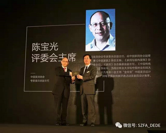 ▲深圳家具研究開發(fā)院許柏鳴院長(zhǎng)為第2屆金汐獎(jiǎng)評(píng)委會(huì)主席陳寶光先生頒獎(jiǎng)