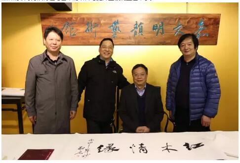 “嘉木明韻”董事長(zhǎng)王嘉明先生(左二)與寧波市副市長(zhǎng)張明華(右二)、寧波市文聯(lián)原黨組書(shū)記鄒大鳴(左一)國(guó)家級(jí)非物質(zhì)文化遺產(chǎn)項(xiàng)目明式家具制作技藝代表性傳承人許建平大師(右一)合影留念