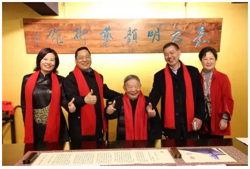 “嘉木明韻”董事長(zhǎng)王嘉明先生(左二)與寧波書(shū)畫(huà)泰斗劉文選先生(中)合影留念