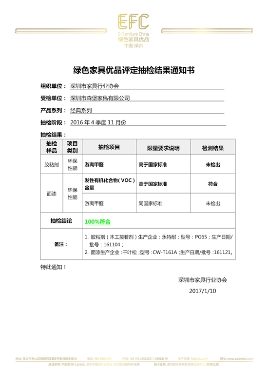 中國綠色家具優(yōu)品工作啟動以來,抽檢工作在深圳家具研究開發(fā)院檢測中心(賽德檢測)主導(dǎo)下有條不紊的進行。2017年初,2016年4季度11月份的抽檢工作圓滿完成,深圳市森堡家俬有限公司經(jīng)典系列抽檢結(jié)果100%符合。