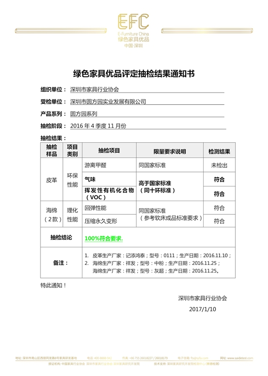 中國綠色家具優(yōu)品工作啟動以來,抽檢工作在深圳家具研究開發(fā)院檢測中心(賽德檢測)主導(dǎo)下有條不紊的進(jìn)行。2017年初,2016年4季度11月份的抽檢工作圓滿完成,深圳市圓方圓實(shí)業(yè)發(fā)展有限公司圓方園系列抽檢結(jié)果100%符合。