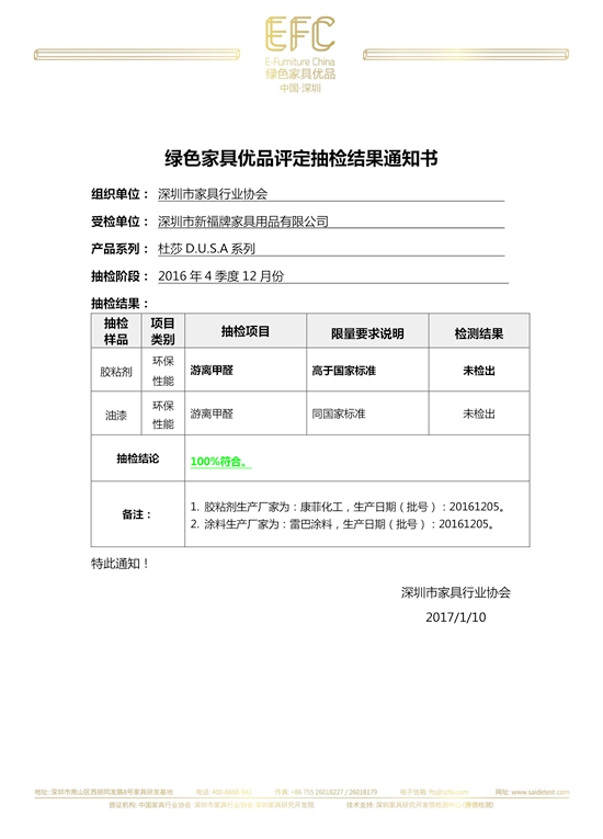 2017年1月10日,2016年中國綠色家具優(yōu)品四季度12月抽檢結(jié)果正式公布,深圳市新福牌家具用品有限公司杜莎D.U.S.A系列被抽取的膠粘劑、油漆兩款關(guān)鍵原材料的甲醛含量與甲醛釋放量均達(dá)到優(yōu)品技術(shù)要求,合格率100%。