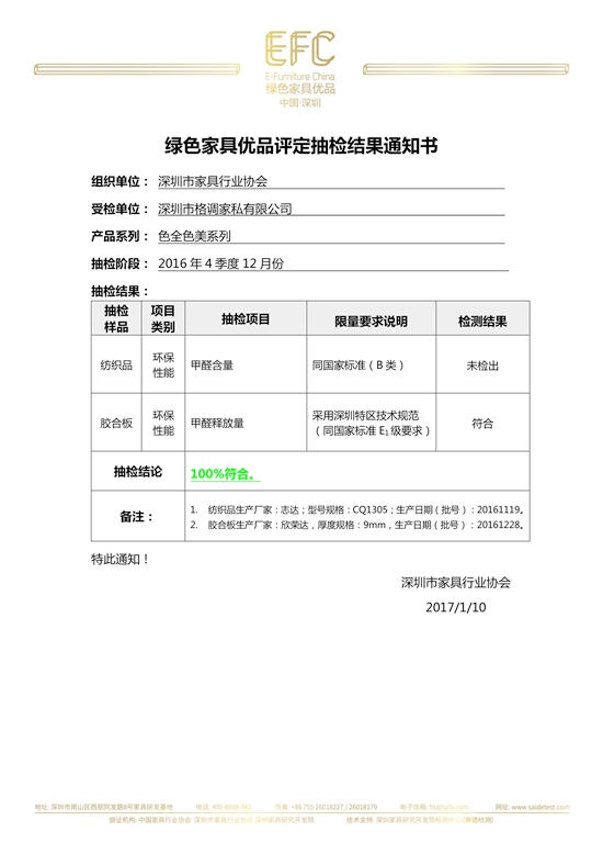 2017年1月10日,2016年中國綠色家具優(yōu)品四季度12月抽檢結(jié)果正式公布,深圳市格調(diào)家私有限公司色全色美系列被抽取的紡織品和膠合板的甲醛含量與甲醛釋放量均達到優(yōu)品技術要求,合格率100%,全年優(yōu)品抽檢工作完美收官。