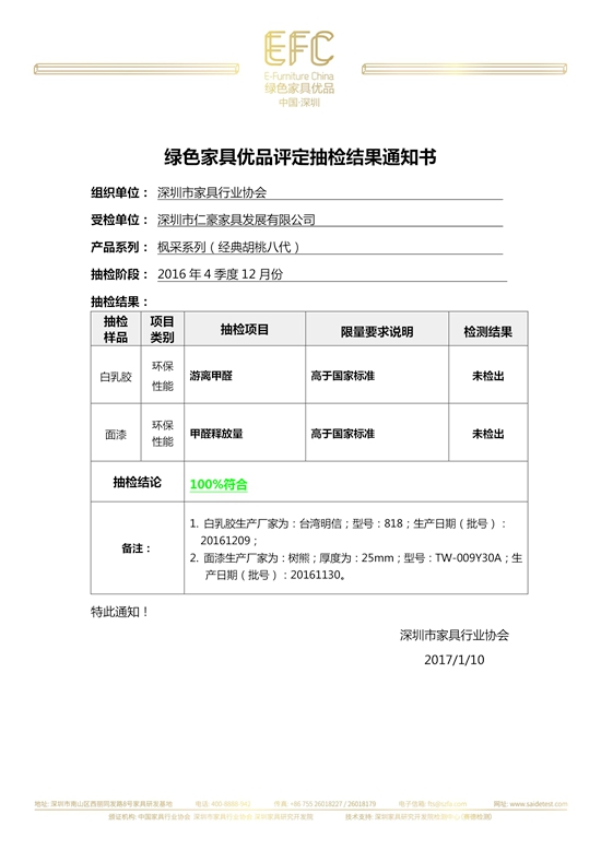 2017年1月10日,2016年中國綠色家具優(yōu)品四季度12月抽檢結(jié)果正式公布,深圳市仁豪家具發(fā)展有限公司楓采系列(經(jīng)典胡桃八代)被抽取的白乳膠、面漆兩款關(guān)鍵原材料的甲醛含量與甲醛釋放量均達到優(yōu)品技術(shù)要求,合格率100%,且高于國家標準。
