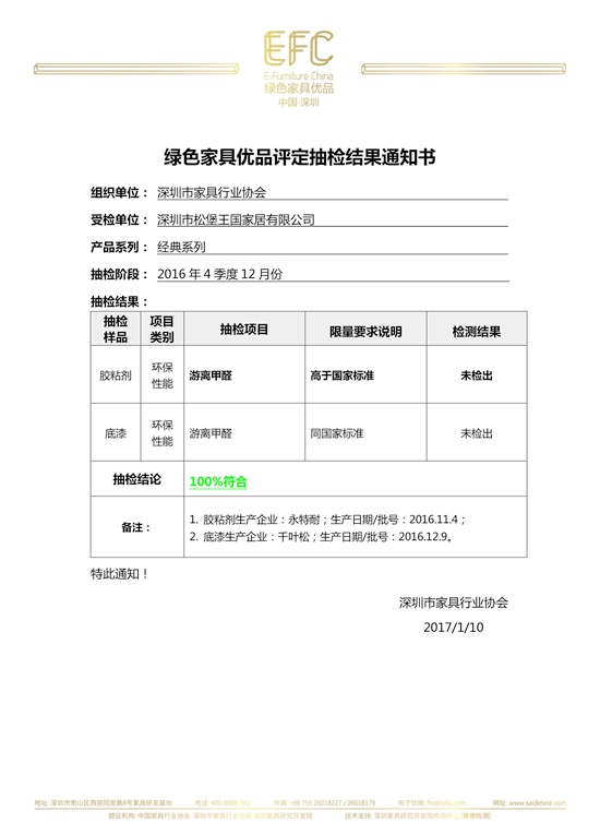2017年1月10日,2016年中國綠色家具優(yōu)品四季度12月抽檢結(jié)果正式公布,深圳市松堡王國家居有限公司經(jīng)典系列被抽取的膠粘劑、底漆兩款關鍵原材料的甲醛含量與甲醛釋放量均達到優(yōu)品技術要求,合格率100%,年度優(yōu)品抽檢圓滿結(jié)束。