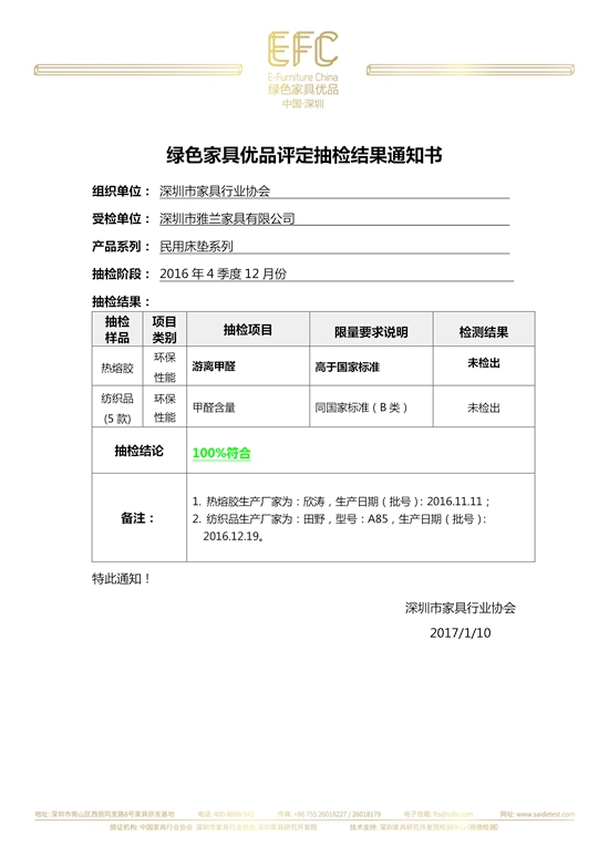 2017年1月10日,2016年中國綠色家具優(yōu)品四季度12月抽檢結(jié)果正式公布,雅蘭民用床墊系列抽取的一款熱熔膠、5款紡織品的游離甲醛和甲醛含量檢測結(jié)果均顯示“未檢出”,合格率100%,為2016年優(yōu)品抽檢工作完美收官。