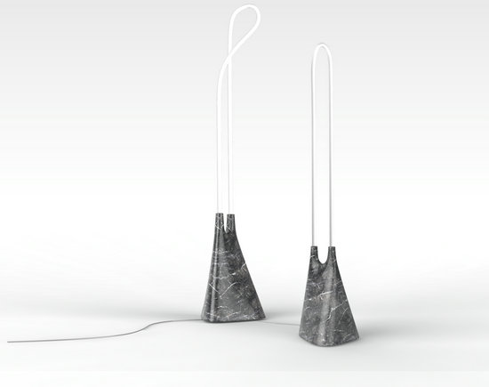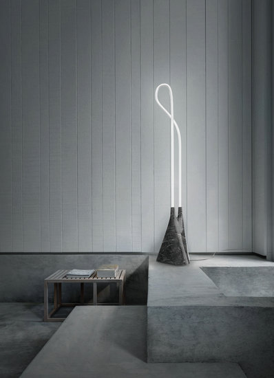 它將扭曲曼妙的的燈管直接裸露在外面,底部是一整塊大理石切割而成的底座。輕盈的光感從沉重的石頭中沖出的對比感,是這個設計主要想表達的效果。