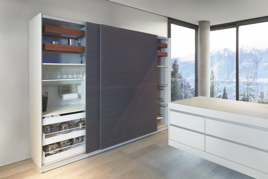 無論是三餐還是一頓盛宴,都需要多方的廚房用品合力協(xié)作。由此,海福樂充分利用廚房的縱向、轉(zhuǎn)角和內(nèi)部更深的空間,設計了立柜和吊柜、轉(zhuǎn)角拉籃、凹型抽屜拉籃以及可伸縮的拉籃,以增強儲藏能力。可一鍵掌控的廚用電動升降五金、移動烤箱或微波爐等,則讓整個空間更加自動、簡潔。