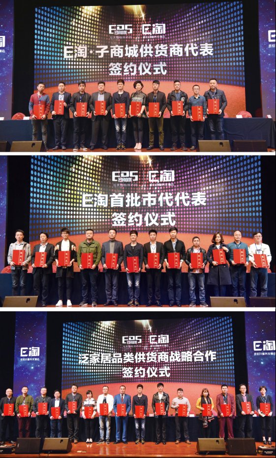 經(jīng)過短暫的休息之后,EDS領(lǐng)軍人陸杭民和期待已久的合作商分別進(jìn)行了E淘子商城供貨商代表簽約儀式、E淘市代簽約儀式、泛家居品類供貨商戰(zhàn)略合作簽約儀式,正式奠定了“商品云、技術(shù)云、網(wǎng)點(diǎn)云”三朵云的基礎(chǔ)。