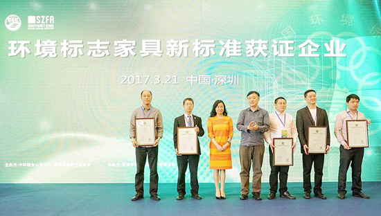 會(huì)議上,主辦方為第一批滿足環(huán)境標(biāo)志新標(biāo)準(zhǔn)的家具企業(yè):曲美家居集團(tuán)股份有限公司、浙江圣奧家具制造有限公司、中山市大華家具制造有限公司、優(yōu)比(中國(guó))有限公司、青島東明家具有限公司頒發(fā)“環(huán)境標(biāo)志證書(shū)”;
