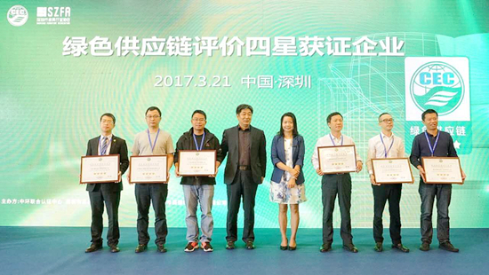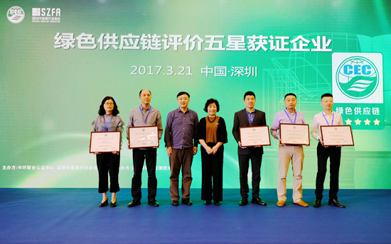中環(huán)聯(lián)合認(rèn)證中心副總經(jīng)理吳冷、深圳市家具行業(yè)協(xié)會(huì)副秘書(shū)長(zhǎng)劉瑞貞為第二批綠色供應(yīng)鏈四星企業(yè)頒獎(jiǎng)