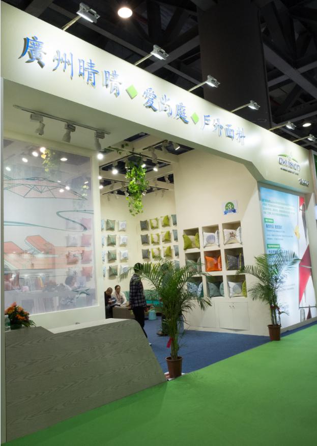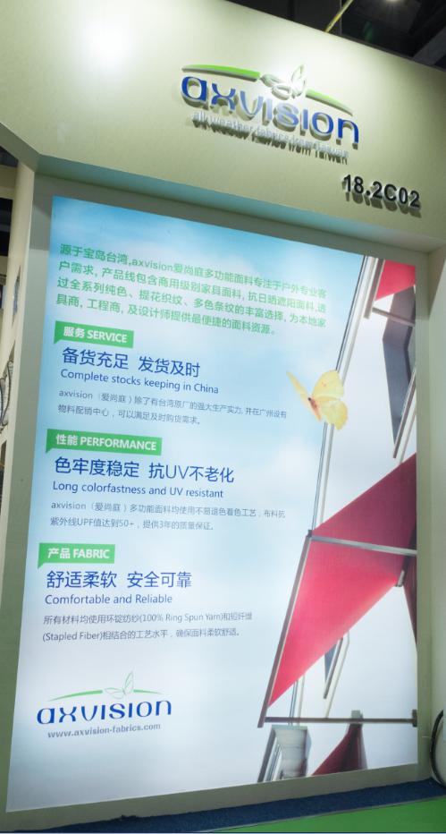 晴晴旗下的axvision(愛尚庭)室外多功能布搭配穩(wěn)定可靠的著色工藝以及細膩短長纖混織, 使得材質軟硬適中且高強度拉力。愛尚庭多功能布料在使用中,不僅壽命長、色牢度穩(wěn)定、抗曬等級達到ISO105B02/B04標準的7-8級(最高為8級),而且布料全面經(jīng)抗紫外線處理, 日光保護指數(shù)可達UPF 50+,深受消費者喜愛,整個生產(chǎn)過程安全環(huán)保,很快在戶外布料行業(yè)中脫穎而出。(如圖是2017CIFF 18.2C02展位展品圖)