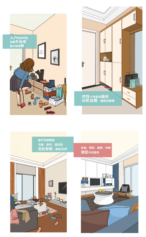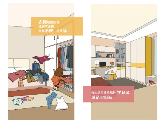 在此基礎(chǔ)上,針對目前中國家庭收納現(xiàn)狀,索菲亞還在白皮書中提出了用定制解決收納難題的理念,并為消費者提供了入戶收納、臥室收納、客餐廳收納、書房收納、兒童房收納和陽臺收納系統(tǒng)。