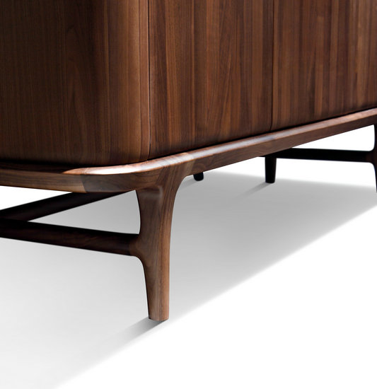 這個系列的邊柜是我比較欣賞的一款,柜子抽屜使用了橫紋的木紋,柜門則使用了豎著的木紋,這個處理非常必要,它打破了單一材質(zhì)的單調(diào)性,讓其有了變化,有細節(jié)可看,而柜腿的設(shè)計,弧度的處理也是非常精彩的。不足的地方就是如衣柜,體量那么大的衣柜使用全胡桃木面,略顯得呆板。