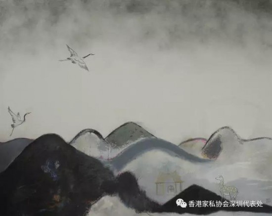 藝術(shù)家黃啟佑的作品運(yùn)用山、水、鶴等東方的元素,營造一種寧靜與仙氣。表現(xiàn)了在當(dāng)下嘈雜喧鬧的社會(huì),藝術(shù)家尋求內(nèi)心的一片凈土。這些藝術(shù)家對(duì)生活有著不同的理解與感悟,并將感悟表現(xiàn)于創(chuàng)作當(dāng)中。