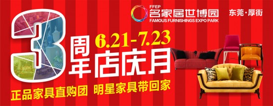 6月21日至7月23日,帶上老媽、愛人、孩子一起來東莞名家居世博園3周年店慶月,吃住行樂購,家居惠生活!500工廠正品家具、助您一跩到底!
