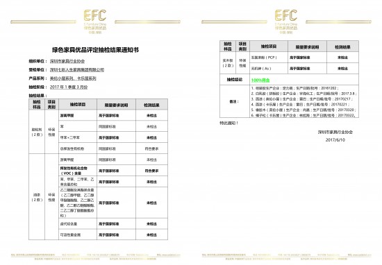 2017年,作為“中國(guó)綠色家具優(yōu)品”首批獲證企業(yè),深圳市家具行業(yè)協(xié)會(huì)檢測(cè)中心(賽德檢測(cè))針對(duì)七彩人生家具的品質(zhì)抽檢工作進(jìn)入第三個(gè)年頭。6月10日,今年第一季度3月份的抽檢工作完成,七彩人生各項(xiàng)抽檢結(jié)果均達(dá)到100%的合格率。