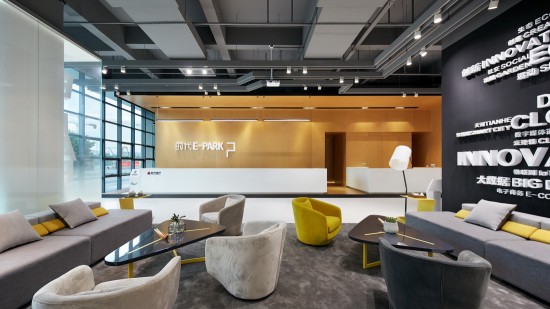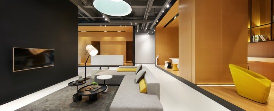淡洽區(qū)以簡約的明黃色為主調,沙發(fā)則走高級灰路線,項目名稱醒目地打在明黃色的墻上,logo的筆觸設計強勁而有力。