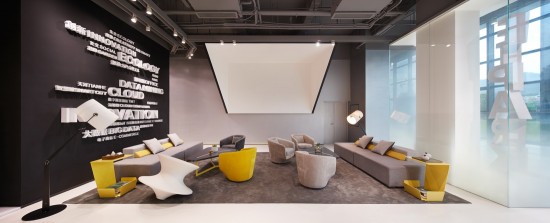 這個獨立的休息區(qū)設計簡潔明快,地毯上的陀螺椅嵌入盜夢空間的元素,沒有冗余的設計讓人仿佛走進另一個空間。