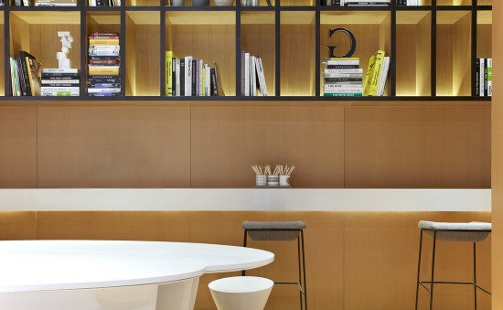有另于洽淡區(qū)的高級灰,閱讀區(qū)的明黃色搶了主角,書架作為背景墻,巨大的木柱子作隔斷,打造獨立而安靜的空間。