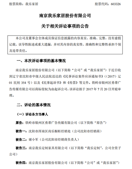 2017年6月13日晚間,我樂家居發(fā)布公告稱,公司于近日收到遼寧省沈陽市中級人民法院送達(dá)的《民事訴訟案件應(yīng)訴通知書》((2017)遼 01 民初 354 號)以及《民事起訴書》和《傳票》等文件。鐵嶺市銀州區(qū)勇蒂廣告?zhèn)髅接邢薰疽陨虡?biāo)侵權(quán)為由起訴公司,該訴訟擬于 2017 年 7 月 20 日開庭審理。