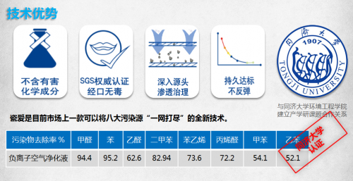 首先,在產(chǎn)品成分上,瓷愛負(fù)離子空氣凈化液,不含任何有害化學(xué)成分,能夠免除消費(fèi)者的后顧之憂。其次,它可以滲透到污染源內(nèi)部,通過擠占解吸作用并加速污染物質(zhì)的釋放。值得一提的是,這項(xiàng)和同濟(jì)大學(xué)環(huán)境工程學(xué)院共同完成的課題從研發(fā)到測(cè)試結(jié)果都是由同濟(jì)大學(xué)檢測(cè)認(rèn)證,具有權(quán)威性。