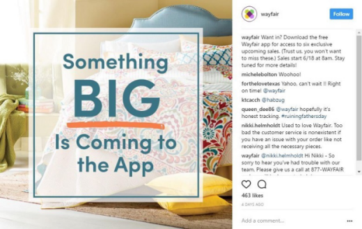 用戶生成內(nèi)容不是唯一的方法。Wayfair還使用獨(dú)家競(jìng)賽、促銷和折扣為Instagram追隨者提供額外的價(jià)值。它最近利用平臺(tái)來宣傳品牌App上即將推出的獨(dú)家系列產(chǎn)品,促使用戶采取行動(dòng)。