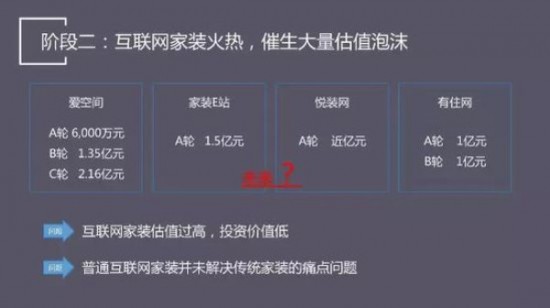 從2012年-2016年是互聯(lián)網(wǎng)家裝快速成長期,互聯(lián)網(wǎng)家裝火熱,帶來了一個(gè)必然的結(jié)果,從資本角度來看,相對于傳統(tǒng)家裝企業(yè),營收數(shù)據(jù)、實(shí)際的服務(wù)體驗(yàn),都出現(xiàn)了比較多的估值泡沫。比如說愛空間、家裝E站、悅裝網(wǎng)、有住網(wǎng)都拿到了比較高的融資,哪怕公司再好,但估值要合理,如果估值太高,可能是一家好公司,但不一定是好的投資,或者讓我們難以下定決心去做這筆投資。普通互聯(lián)網(wǎng)家裝企業(yè)并未解決核心的家裝痛點(diǎn)問題。