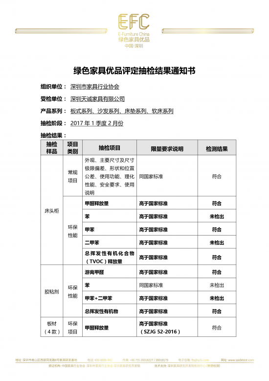 根據(jù)賽德檢測出具的《綠色家具優(yōu)品評定抽檢結(jié)果通知書》顯示:針對深圳天誠家具有限公司參評準(zhǔn)入的板式系列、沙發(fā)系列、床墊系列、軟床系列,賽德檢測隨機(jī)抽取了床頭柜、膠粘劑、白乳膠、刨花板、板材、水性白亮光面漆、皮革紡織品等成品及關(guān)鍵原輔材料;針對深圳興利家具有限公司參評準(zhǔn)入的興利澳瑪、興利摩高兩大系列,隨機(jī)抽取了床頭柜、白乳膠、板材等成品及關(guān)鍵原輔材料;針對深圳市華意整體家居有限公司參評準(zhǔn)入的摩地納系列、