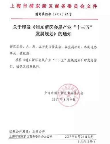 2017年8月24日,上海浦東新區(qū)商務(wù)委員會(huì)發(fā)布了《浦東新區(qū)會(huì)展產(chǎn)業(yè)“十三五”發(fā)展規(guī)劃》的通知,該文件明確指出: