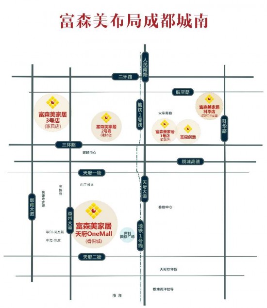 分別是位于成都城南的軟裝1號店、建材2號店、家具3號店、富森創(chuàng)意,位于城北的進口館、建材館、家具館、裝飾建材總部市場、今年7月剛開業(yè)的名品街大店集群,以及富森美新都店。