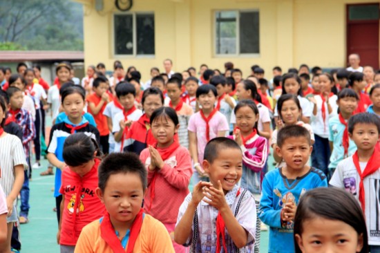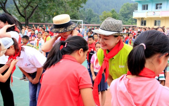令人感動(dòng)的是,溫泉鎮(zhèn)中心學(xué)校的余恩學(xué)校長(zhǎng)知道我們要來(lái),推掉原計(jì)劃的會(huì)議,早早的在去小學(xué)的必經(jīng)路上等我們。到達(dá)學(xué)校時(shí),師生早已在操場(chǎng)上整齊排列,等待我們的到來(lái)?!?br />