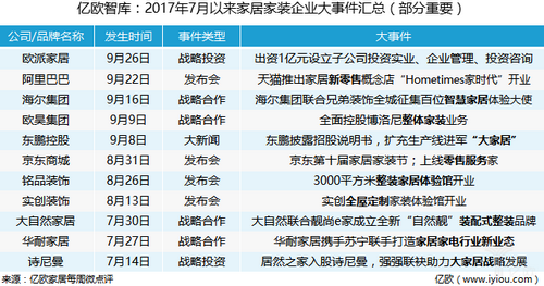 近幾個月,家居家裝的大新聞并不少,除了企業(yè)融資,億歐整理了2017年7月以來行業(yè)大公司重點大事件,從以下圖表得知,家居企業(yè)歐派家居、華耐家居、大自然家居、詩尼曼等紛紛戰(zhàn)略布局產(chǎn)業(yè)鏈,阿里巴巴、京東商城電商平臺布局線下家居新零售,也有裝飾企業(yè)如實創(chuàng)、銘品大力推進全屋定制/整裝業(yè)務(wù)…從以下圖表里也能清晰感知到在接下來的下半年里,新零售、整裝、全屋定制、大家居、智能家居將會成為家居家裝產(chǎn)業(yè)主戰(zhàn)場,雖然目前還只是前期投入階段,市場也不夠成熟,但只要抓住“勢”并且快速發(fā)展,與競爭者拉開距離就只是時間的問題了。