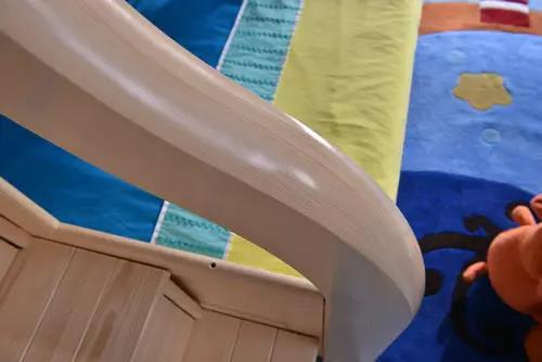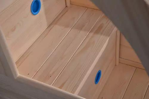 雙層床的樓梯從安全角度出發(fā),也設(shè)計(jì)為弧形狀,有效將力垂直向下分解,減輕梯子的受力。“樓道”彎曲的木材采用獲得專(zhuān)利的彎曲拼板工藝設(shè)計(jì),是從整根原木中直接取出來(lái)的,非常牢固、安全,而且彎曲弧線(xiàn)制作成大象鼻子的造型,增添童趣。階梯上的抽面板運(yùn)用了隱形拉手,踏步板上附有防滑墊,有效避免孩子們摔倒或磕傷。