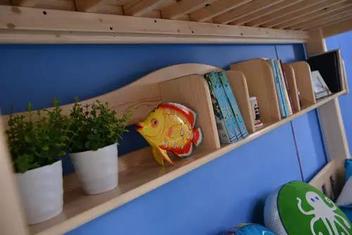 設(shè)計(jì)師圍繞“海底世界”主題,打造兒童喜歡的海底美妙的生物,如床中間的海豚造型書(shū)架,而床圍欄的圓形鏤空設(shè)計(jì),猶如海豚或海底動(dòng)物吹出的泡泡,抽屜拉手的圓形設(shè)計(jì)也相互呼應(yīng)。感覺(jué)進(jìn)入一個(gè)海底世界,特別是在墻紙或床品上,按“海底世界”主題設(shè)計(jì),藍(lán)色打底,增加海底生物等裝飾,則整個(gè)房間都充滿(mǎn)海的自由而神秘的味道。