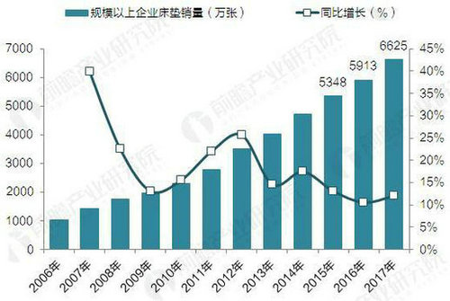 另?yè)?jù)前瞻產(chǎn)業(yè)研究院發(fā)布的《2017-2022年中國(guó)床墊行業(yè)市場(chǎng)前瞻與投資戰(zhàn)略規(guī)劃分析報(bào)告》統(tǒng)計(jì),我國(guó)規(guī)模以上企業(yè)床墊銷(xiāo)量呈快速增長(zhǎng)趨勢(shì),尤其是2007年增速高達(dá)39%,2009年以來(lái)年均增速保持在18%以上,2016年規(guī)模以上企業(yè)共銷(xiāo)售床墊5913萬(wàn)張。