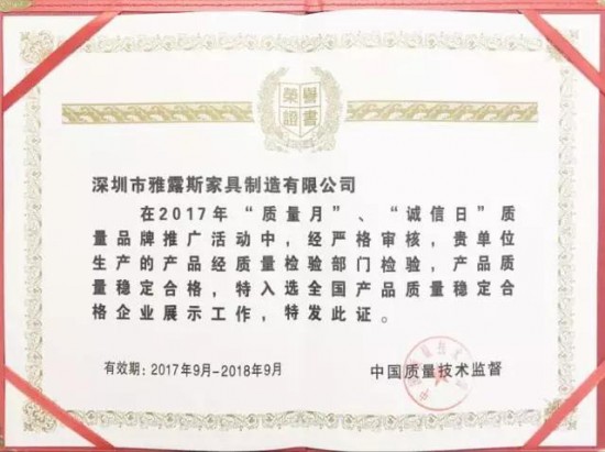 全國“質(zhì)量月” 雅露斯入選全國產(chǎn)品質(zhì)量穩(wěn)定企業(yè)