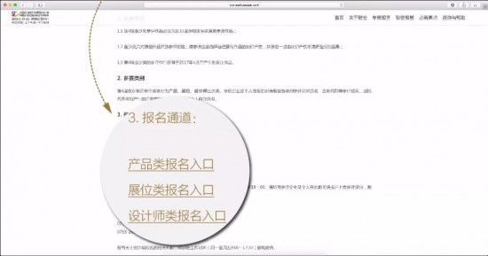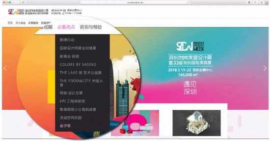 方式2:或者進(jìn)入深圳國際家具展官網(wǎng),點(diǎn)擊目錄欄“必看亮點(diǎn)”下拉菜單“金汐獎(jiǎng)”進(jìn)入報(bào)名頁面。
