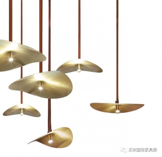 “金荷”荷葉形的銅盤,鍍滿金色光澤,被真皮E帶吊著緩緩垂下,光影交接中宛若遇見仙境里的事物。當(dāng)一組燈具高低錯落地?cái)[在一起的時(shí)候,仿佛是金色的荷塘在天空中的倒影,營造了一種極其夢幻的氛圍。金屬與皮的搭配也凸顯了不同材質(zhì)的質(zhì)感。