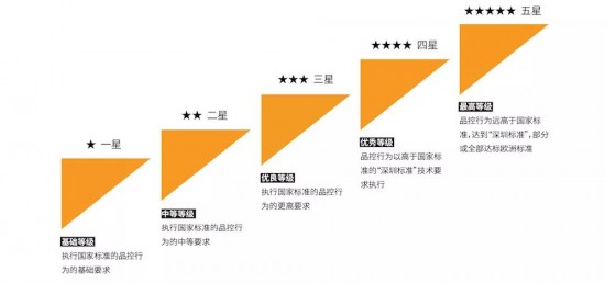 品質(zhì)星級評定,共分為六大等級標(biāo)準(zhǔn),最低1星標(biāo)準(zhǔn),參展商需提供符合國家標(biāo)準(zhǔn)的家具成品1頻次和關(guān)鍵原材料1頻次送檢的檢測報告,次高5星標(biāo)準(zhǔn),由專業(yè)的第三方檢測機構(gòu)對企業(yè)的品質(zhì)控制體系進(jìn)行全面審核,并以高于國家標(biāo)準(zhǔn)的歐盟標(biāo)準(zhǔn)對關(guān)鍵原材料及成品進(jìn)行嚴(yán)格抽檢,最高為5星+中國綠色家具優(yōu)品標(biāo)準(zhǔn),參展企業(yè)必須達(dá)到中國綠色家具優(yōu)品的各項要求。即是中國綠色家具優(yōu)品作為深圳展最高的參展標(biāo)準(zhǔn),在展會層面激勵、推動所有參展商向更高標(biāo)準(zhǔn)、更高品質(zhì)邁進(jìn),以持續(xù)提升中國家具的品牌形象和價值。