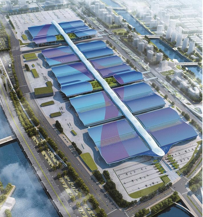 項(xiàng)目總建筑面積158萬平方米,功能涵蓋展覽、會(huì)議、演藝、體育、餐飲等,屋面藍(lán)色絲帶花紋,寓意“海上絲綢之路”。整體完建后,展示面積可達(dá)到50萬平方米,將超過德國漢諾威會(huì)展中心,成為全球規(guī)模最大的會(huì)展中心。