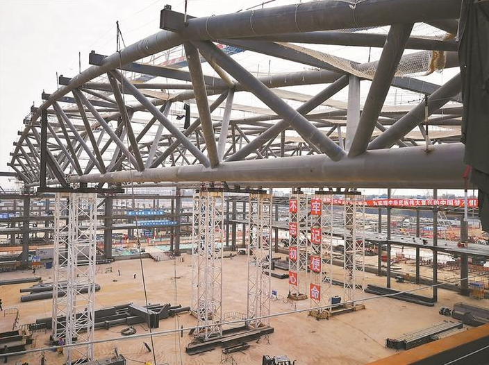 據(jù)悉,項(xiàng)目最大的特點(diǎn)就是施工資源投入量大,管理難度高。4個(gè)月內(nèi)需完成鋼結(jié)構(gòu)圖紙深化,出圖約10萬張;7個(gè)月內(nèi)中建鋼構(gòu)五大制造廠需完成22萬噸鋼構(gòu)件制造;8個(gè)月內(nèi)需完成主體鋼結(jié)構(gòu)吊裝,單月鋼結(jié)構(gòu)安裝量最高達(dá)3萬噸,相當(dāng)于3座巴黎埃菲爾鐵塔。高峰期施工人員將達(dá)20000人次,大型施工機(jī)具投入量達(dá)400臺(tái),日進(jìn)場和轉(zhuǎn)運(yùn)材料達(dá)1.5萬噸以上。值得一提的是,項(xiàng)目鋼結(jié)構(gòu)總用量達(dá)22萬噸,為全球房屋建筑領(lǐng)域之最,總用鋼量相當(dāng)于4座帝國大廈;總占地面積126萬平方米,相當(dāng)于5座鳥巢,建成后將成為全球建筑面積最大的單體建筑。