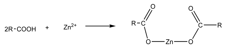 碳酸銨鋯鹽或碳酸銨鋅鹽與樹脂羧基的交聯(lián)反應(yīng)可室溫進(jìn)行,產(chǎn)生的離子鍵有很好的耐熱性和耐醇性,交聯(lián)后涂膜硬度和耐水性可得到改善,其反應(yīng)式如下。