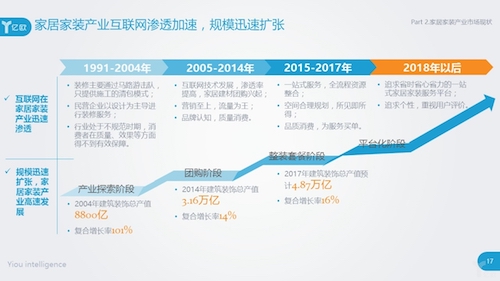 伴隨著互聯(lián)網在家居家裝產業(yè)的加速滲透,從1991年至2016年的26年里,建筑裝飾工程總產值達到了4.87萬億元,整個家居家裝產業(yè)從最初的產業(yè)探索階段,經歷了團購階段、整裝套餐階段后,平臺化開始興起。