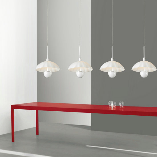 點評意見:白色的燈體與黑白灰的室內空間相得益彰,在這樣一個干凈簡約的空間中出現(xiàn)了一抹高純度的紅色,為整個空間帶來了強烈的視覺沖擊力,降落傘造型的流線燈體柔化了空間硬朗線條帶來的冰冷感;黑色的燈體與黑色的桌子在灰白空間中給人呈現(xiàn)出的是一種酷酷的格調;燈桿由直線變?yōu)榛【€時,這款燈又為空間帶來了不同的精神內涵,使得整個空間呈現(xiàn)出含蓄、寧靜的氛圍。