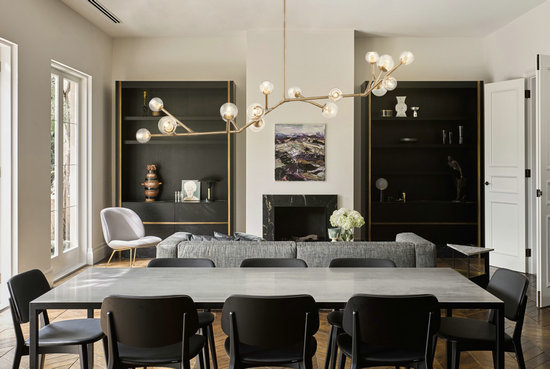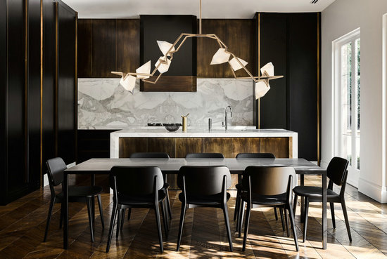 點評意見:簡潔現(xiàn)代、井然有序的空間秩序被餐桌上方的吊燈驟然打破,金色的黃銅材質優(yōu)雅精致,是貫穿所有空間的提亮元素。不對稱的造型、自然有機的仿生形態(tài),在空間里加入了生態(tài)的氣息,左右橫出的枝丫與魚骨紋地板巧妙地形成了有趣的呼應,大小不一、方向各異的圓形燈頭,和直線構成的室內空間構成了最佳的變異與調和。