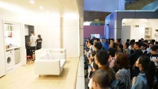 走進5號館內(nèi),一個濃縮于“小麻雀”的18-32平方米的“極小公寓”,吸引了大量人群圍觀,人們紛紛駐足看設(shè)計師“變魔術(shù)”般地滿足人們?nèi)粘I畹姆椒矫婷妗?/div>