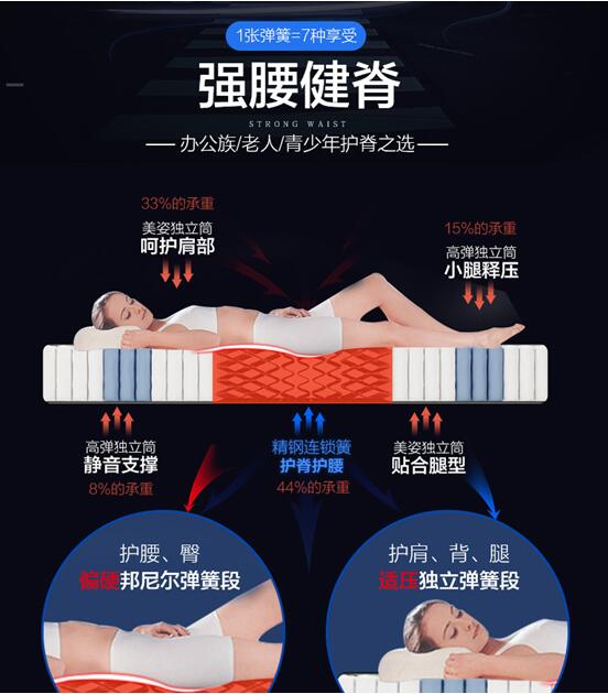 4S墊使用的七區(qū)支撐系統(tǒng),由獨(dú)立筒彈簧+六環(huán)精鋼連鎖簧構(gòu)成,針對頭、肩、背、腰、臀、大腿、小腿七區(qū)分段設(shè)計(jì),適應(yīng)身體各個(gè)部位的支撐,強(qiáng)腰健脊,保護(hù)身體。