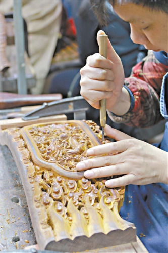 核心提示:胡敏強(右)在指導(dǎo)年輕人雕刻紅木?! ∮浾咦呓鼜V式硬木家具制作技藝傳承人  情系紅木三四十載  收徒數(shù)千僅1%出師  自清