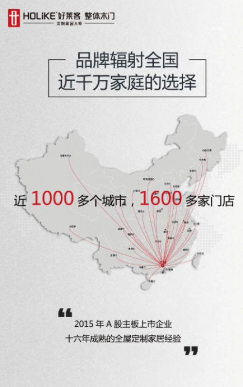 自2002年成立至今,好萊客始終立足現(xiàn)代家居市場需求、不斷引領(lǐng)行業(yè)潮流,致力于為全球消費(fèi)者定制專屬的舒適生活體驗(yàn)。2015年,好萊客成功上市,成為定制家居行業(yè)A股主板上市企業(yè)(股票代碼:603898),目前,好萊客加盟商遍布全國1000多個城市共計(jì)1600多家。